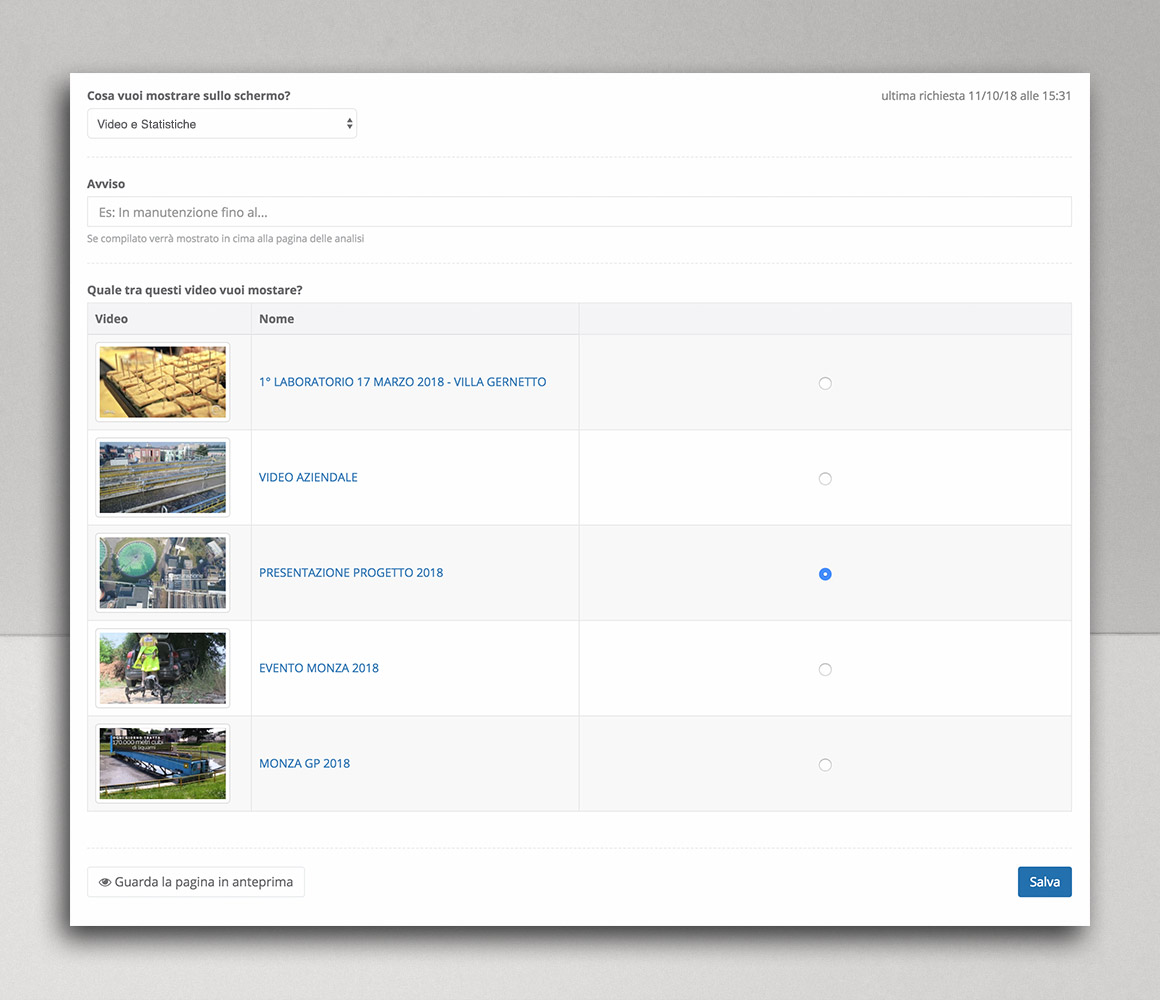 È possibile scegliere quale contenuto trasmettere per ogni monitor. I contenuti sono personalizzabili in base alle esigenze e possono essere video in streaming, foto, pagine informative in HTML, avvisi, ecc.